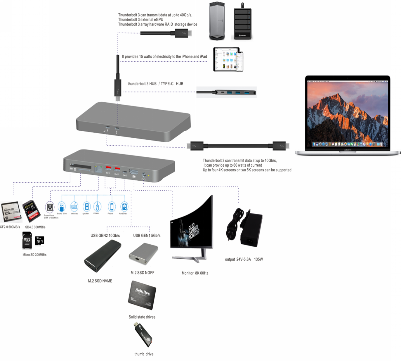 thunderbolt3菊花链,最多支持6个雷电3产品以菊花链的方式连接。(存储设备在末端)