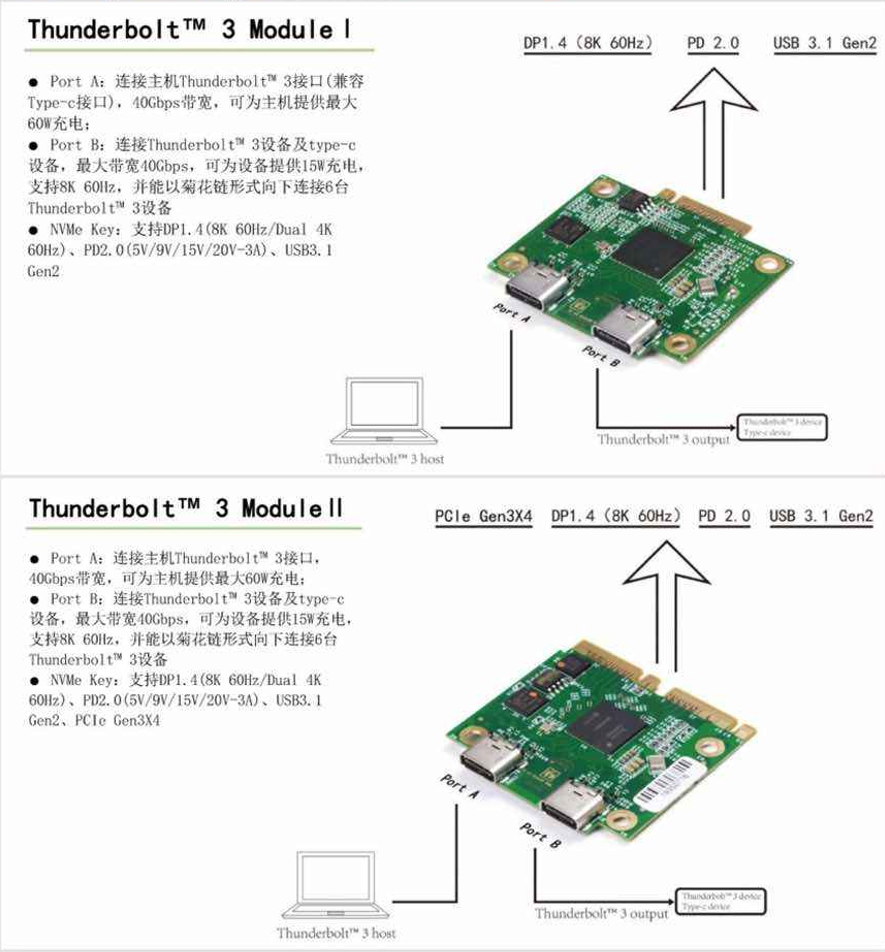 本方案基于Intel JHL7440开发的Thunderbolt™ 3 Module,应用于雷电3Dock扩展坞,雷电3显卡扩展坞,雷电3多盘位硬盘盒(柜),雷电3转PCIE方案。Module优点在于不需要每款产品都重新设计雷电3高速线路,只需设计I/O部分,雷电3部分高速电路无需重新设计,缩短开发时间减少开发成本;另一大优点是,认证费用和认证周期会大大缩短,由我们帮确认客户PCB原理图,确保一次过认证,再送Intel,百佳泰测试时间将会减少一半3个月内认证完成,并且使用Thunderbolt™ 3 Titan Ridge 测试费用会降到10000美金,认证完成后英特尔再补贴50%。