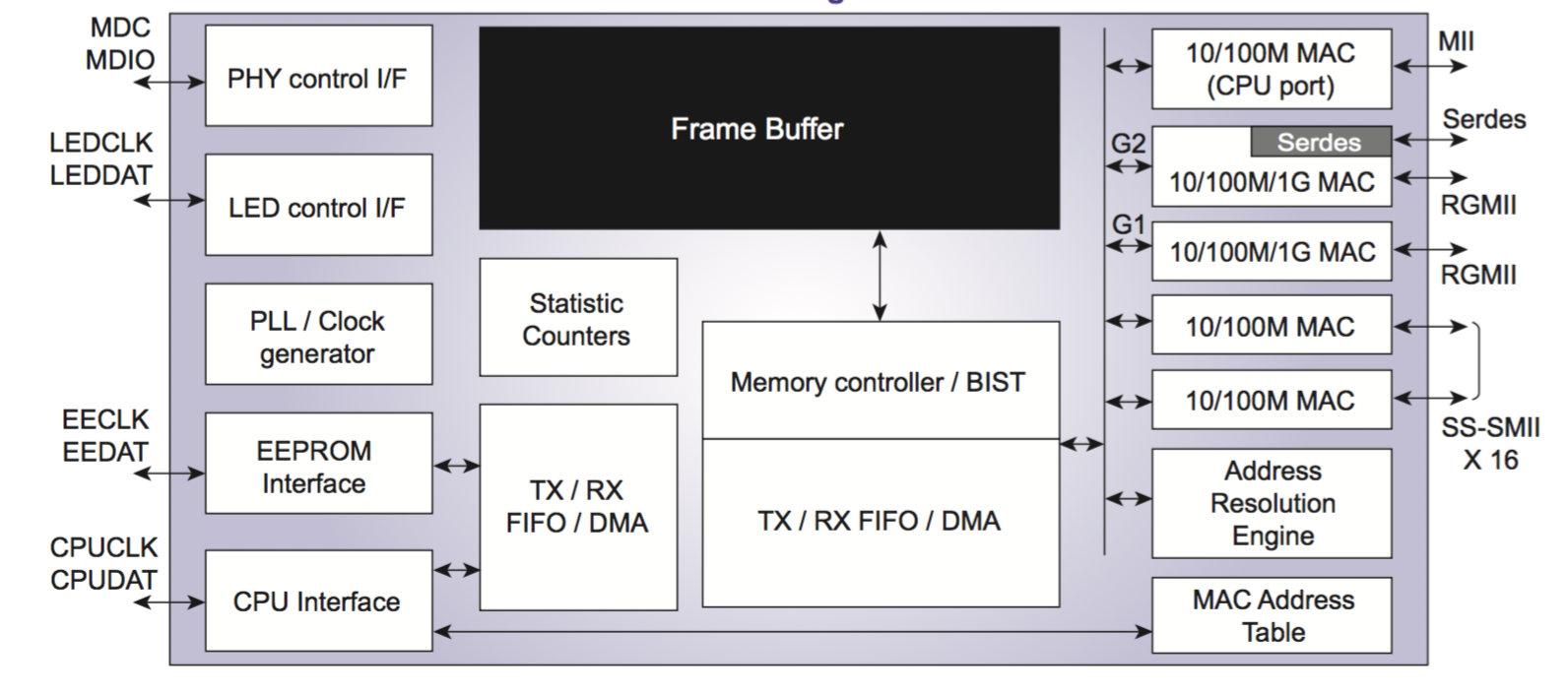 • Provides 16 port SS-SMII, 2 RGMII, one 1000Base-X SERDES and one MII