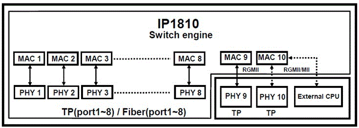IP1810 is a non-blocking, store-and-forward architecture switch controller, which builds 8-port 10/100Mbps Fast Ethernet MAC and PHY, 1-port GMAC with RGMII interface and 1-port with RGMII/MII for external CPU in a single chip.